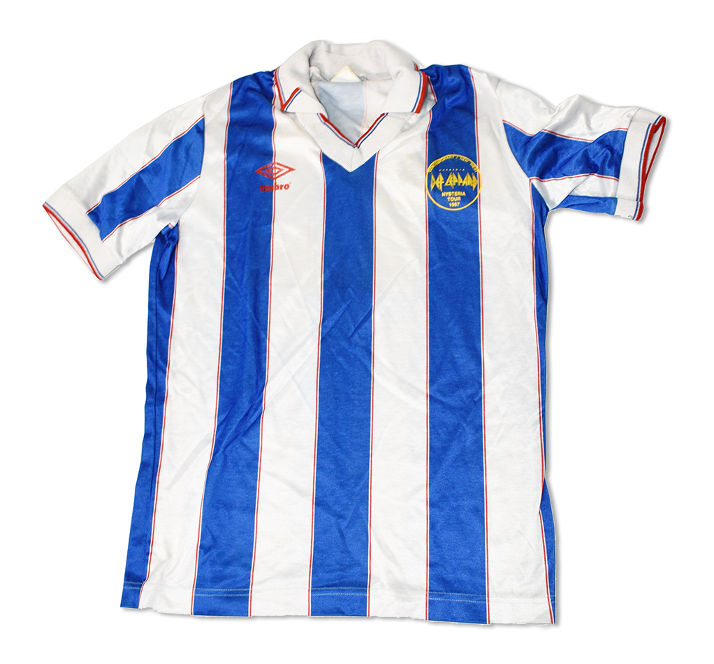 Steve Clark's personal Hysteria tour football shirt, 1987. Based on Sav's favorite football team, the Sheffield Wednesdays, this collared blue and white striped shirt with red accents reads "Def Leppard Hysteria Tour 1987" on the right breast, and clearly reflects the band's love of soccer. Umbro logo in red on the left breast. We're team Leppard all the way. Courtesy of the Lorelei Shellist Private Collection.