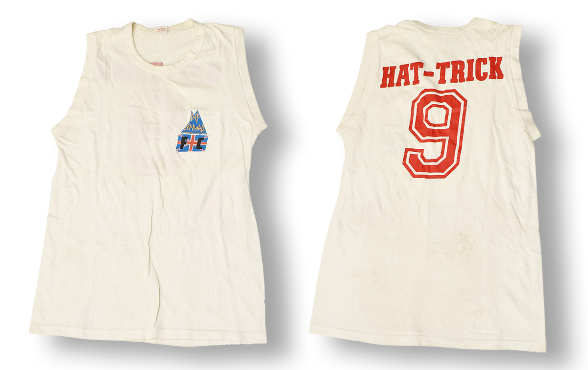 Joe Elliot's Def Leppard sleeveless Pyromania-era football shirt. The blue and yellow Def Leppard logo is on the breast atop a Union Jack flag and the initials FC. "Hat-Trick" (Joe's nickname because he scored three goals in a soccer match every time they played) and the number 9 are printed on the back (Joe played center forward). This sporty shirt was clearly well-loved, and shows signs of wear. From the collection of Def Leppard.