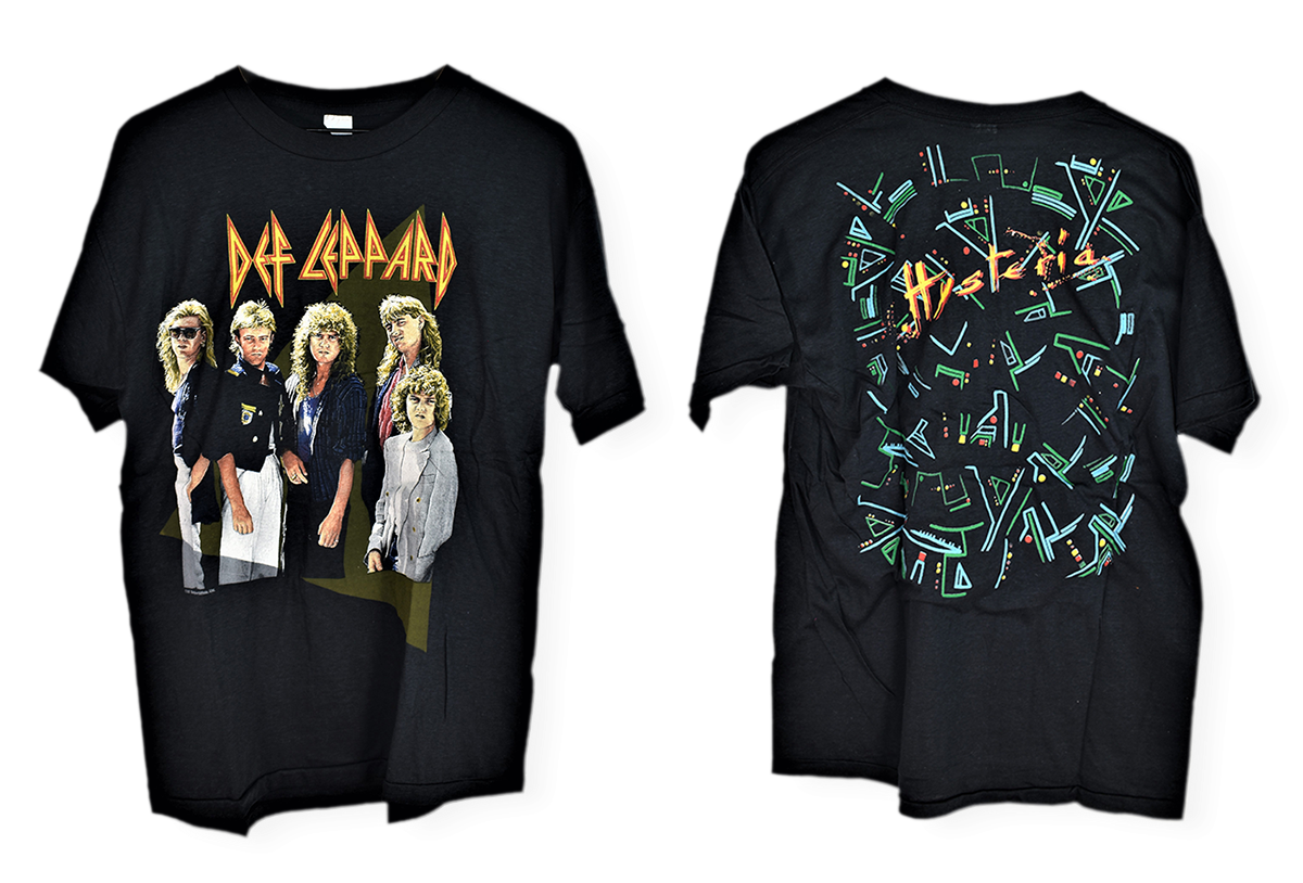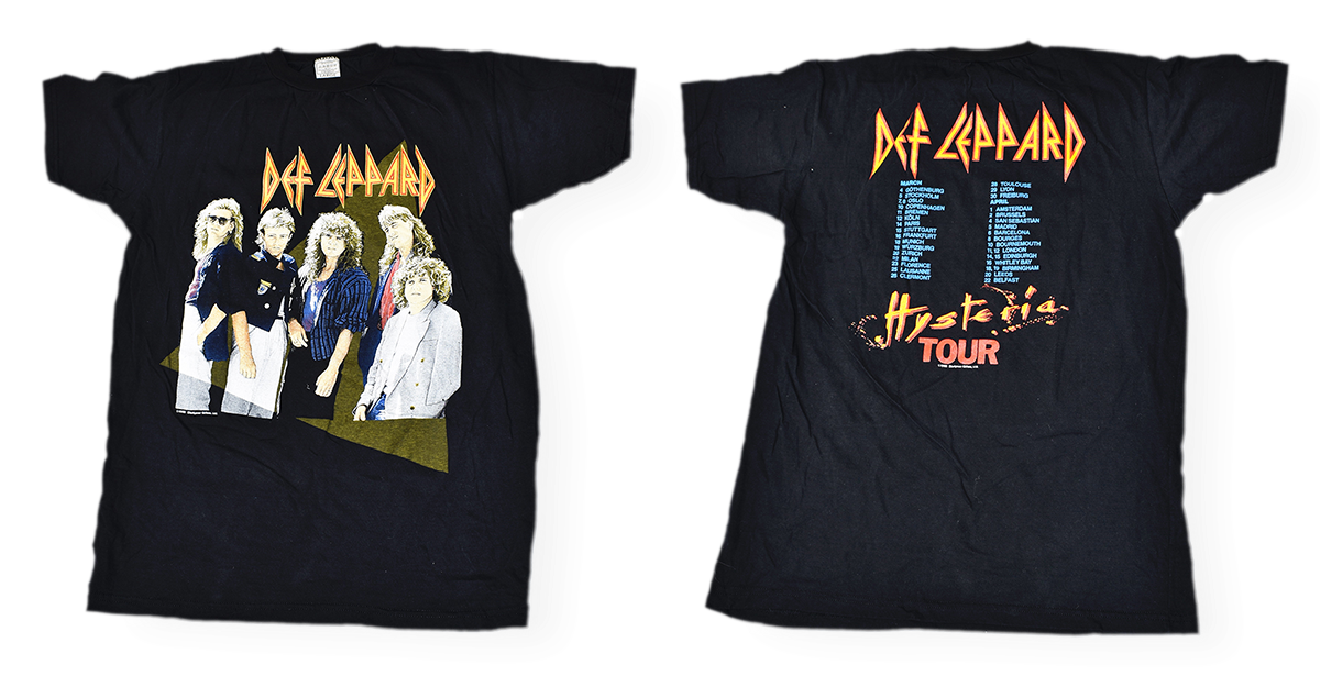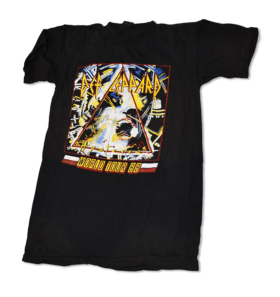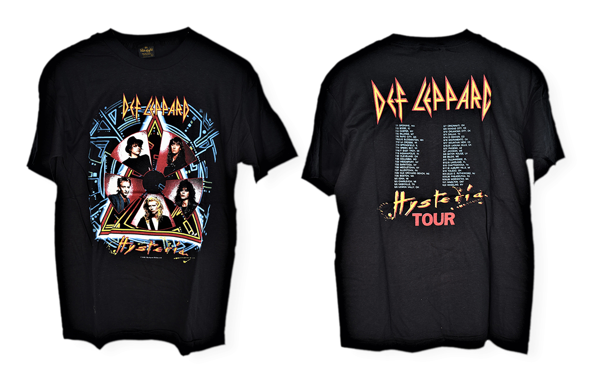 Perfect original black Hysteria Tour t-shirt belonging to Steve Clark. Andie Airfix design with all five band members in color emblazoned on the front. Dates from the North American tour, 1st July in Spokane, WA through 2nd October in Wheeling, WV, 1987. Better start believing this shirt is a classic. Courtesy of the Lorelei Shellist Private Collection.