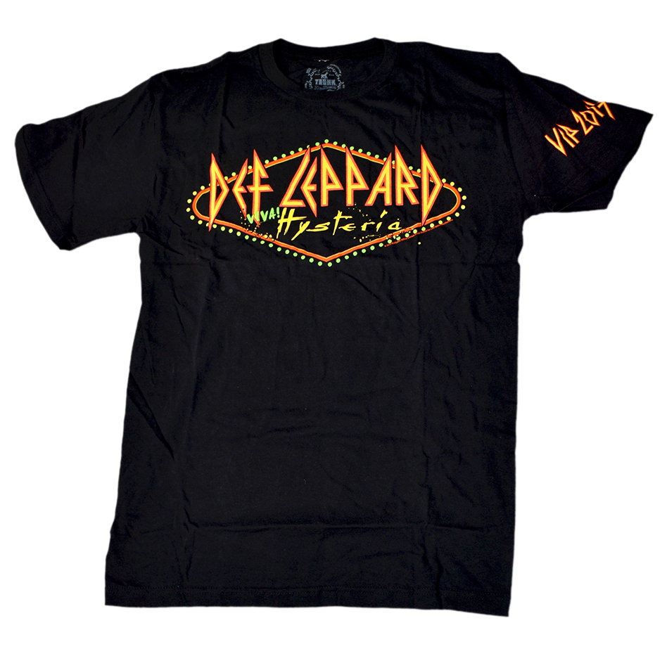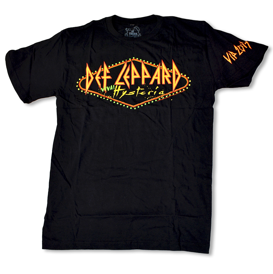 Black VIP Viva! Hysteria tee. This shirt commemorates Def Leppard's Vegas residency and 2013 performances at The Joint at the Hard Rock Hotel & Casino. From the collection of Def Leppard.