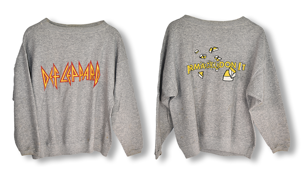 Steve Clark's grey crewneck "Armageddon It" sweatshirt with classic yellow and red Def Leppard logo on the back, 1987. Joe speaks to the writing of this Def Leppard massive hit single: "Right, Armageddon It, to my memory, which is pretty thin on this one. It was a Sav idea from Booterstown in '84. And it started off as the most ridiculously simplistic, almost Germanic, marching tune. It was just the drum rhythm was very similar to what the song is now, but the guitar part just went, "Bah, bah, bah, bah." And that was it, it was so simplistic, it was silly. It was a vehicle for a vocal is what it was. And we came up with all these great phrases and it was just like loads of different melodies, and it was like ten different verses in one verse. But it just didn't work, and we weren't really happy with it. And then one day, I know Steve was quite instrumental in the change. He started playing the T-Rex kind of guitar part for the verses, a bit "Get It On-ish," if you like, or "Bang a Gong," if you're an American. And it had that kind of T-Rex feel, which led us down a completely different path. Once he started playing like T-Rex, lyrically, I really wanted it to go like "Get It On." And I've often said, as fans can testify, the phrase, "hubcap diamond star halo" from the song, "Get It On," by T.Rex, has always been a great example of mine as sort of how everything doesn't have to be, "The answer my friend, is blowing in the wind." You can just have these awesome, great words that don't mean shit. They don't mean anything, but they work brilliantly over a tune. They become a lyric by just being great phonetic phrases. And so that's how the lyrics started coming along. And we had this great opportunity because the song's in E to use two octaves on the voice. So I could start the song off really low, and then for the second half of the verse, jump an octave, and go to the more acceptable rock and roll register, if you like. And that's what we did. And eventually we get to the chorus, which again, is just a typical three-chord Leppard jangle. And we had it and it's sounding really cool. And we just started singing phrases that would fit. MTV hadn't started in Europe, so it would have been some fake MTV on some Dutch TV channel, was showing what was going off in America at the time. And they would have been about three years behind. So they were playing a lot of the ZZ videos from the Eliminator album. And, just for a joke, because the words fitted, the phrase, "Give me all your loving" seemed to fit the first line of Armageddon It, so we sang it. "It'll do until we come up with some real words." There's the big problem. When you do that, you get so locked in that you can't think of anything any better. So I'm sure we were thinking, "Billy Gibbons is going to hate us for this." It turns out he didn't at all. But we got to the point where it's like, "What are we going to sing?" And I had no idea who, probably Mutt, just went, "I'd leave it if I were you, it sounds great." So we did, and we just built the lyric around that, "Give me all your loving, give me all you can, blah, blah, blah." And that's what we sang. And we left it alone. Nobody ever accused us of plagiarism, which is quite astonishing, really. Because it's pretty obvious what it came from. But it was a marker that we stuck with, because it's a great hook." Courtesy of the Lorelei Shellist Private Collection.