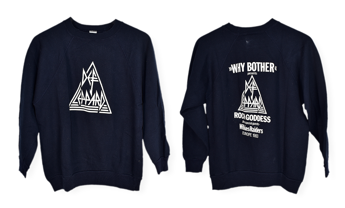 Steve Clark's navy blue crewneck sweatshirt from the Pyromania Europe Tour, 1983. Classic white Def Leppard logo printed on the front and back, as well as opening acts Rock Goddess and Wilkies Raiders. Rock Goddess was an all-female trio formed by sisters Jody and Julie Turner in South London, 1977. Of the experience, Jody said in an interview, "We toured with Leppard twice and apart from the band being lovely people, the crew and everyone were so helpful and nice to us and it was such a great experience. And then to watch them from the side of the stage with a beer? We were living the dream!" Courtesy of the Lorelei Shellist Private Collection.
