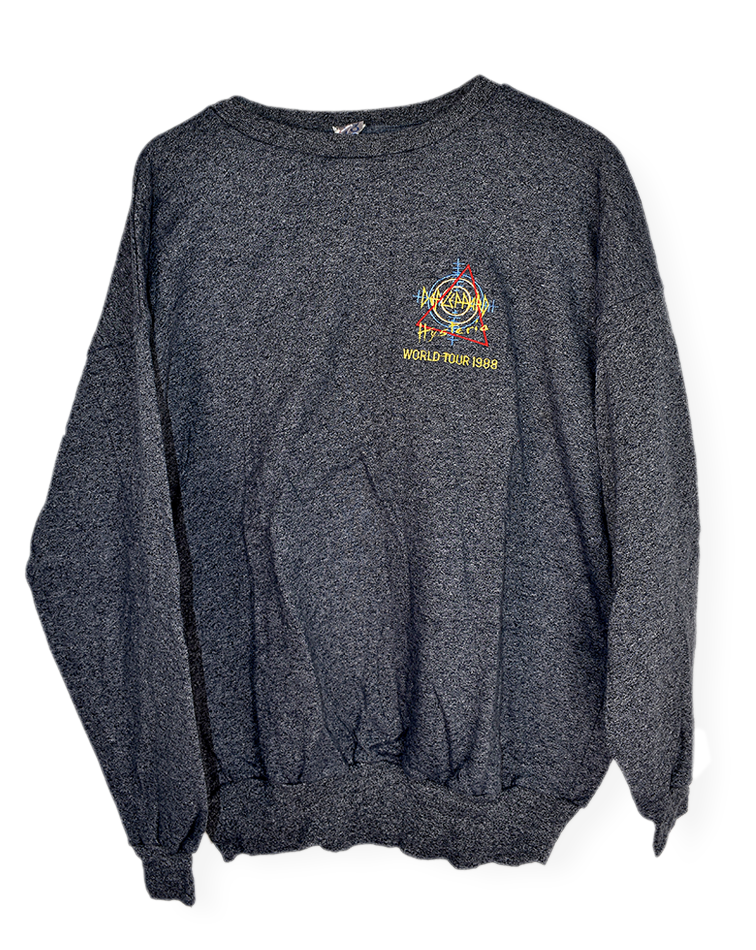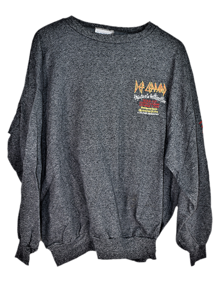 Steve Clark's grey Hysteria sweatshirt with the "Hysteria" logo design and "World Tour 1988" underneath on the left side of chest. In good condition. Courtesy of the Lorelei Shellist Private Collection.