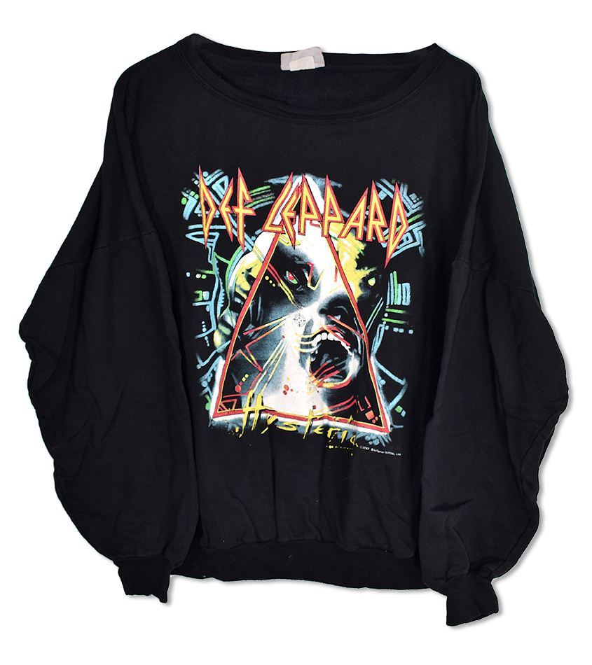 Black sweatshirt with the Hysteria faces and band logo centered on the chest. This sweater has many signs of wear and splits from age. From the collection of Def Leppard.