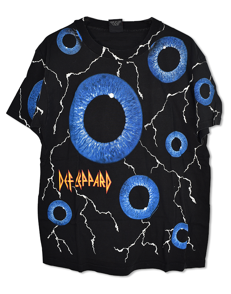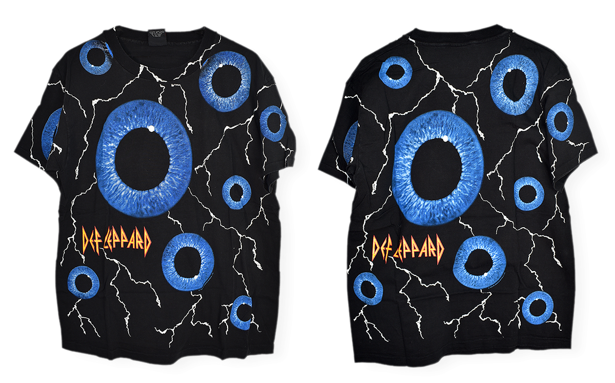 Steve Clark's black Adrenalize tee with blue eye and lightening bolt pattern. Red and yellow Def Leppard logo on the front. In good condition. Courtesy of the Lorelei Shellist Private Collection.
