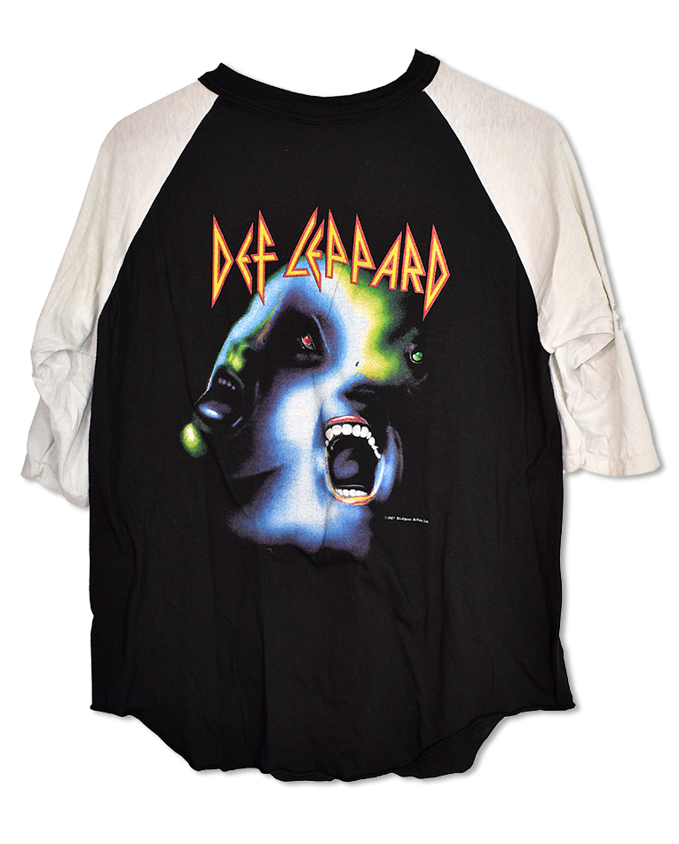 Steve Clark's black baseball tee with white mid-length sleeves and Hysteria design on the chest. "Def Leppard Hysteria Tour 87" on the back. Good condition, but with signs of wear. Courtesy of the Lorelei Shellist Private Collection.
