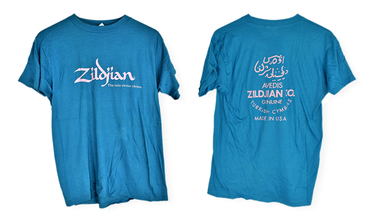 Steve Clark's personal t-shirt with the Zildjian logo in pink on the front, and "Avedis Zildjian Co. Genuine Turkish Cymbals Made In USA" printed on the back. Steve was known to hit a Zildjian cymbal with the neck of his guitar a time or two. The company is the largest cymbal and drumstick maker in the world, and was founded in Constantinople by Avedis Zildjian in 1623. In good condition. Courtesy of the Lorelei Shellist Private Collection.