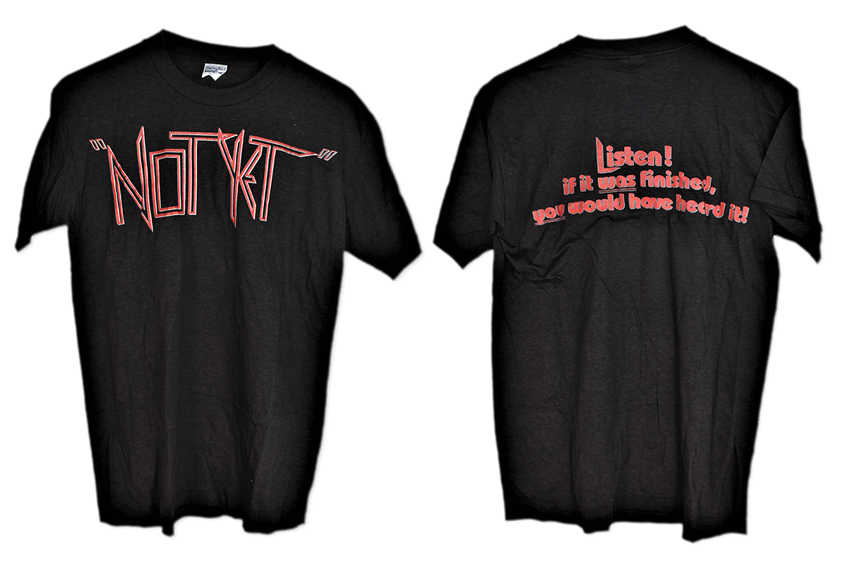 Steve Clark's personal, ultra rare, inner-circle-only, Andie Airfix-designed and made between early-1985 - mid-87. It has the Def Leppard font black t-shirt, printed to answer those pesky and persistent questions about Hysteria's release. The answer was of course, "NOT YET." For emphasis, the back reads, "Listen! If it was finished, you would have heard it!" Rick Savage tells the tale... Sav: It just reminded me of blimey, how long it was taking us to actually make the record. 'Cause we went through so many processes in the process of making Hysteria. And obviously we'd just come off the back of an extremely successful album, with Pyromania. And of course everybody was expecting to hear the follow-up, everybody wanted to know, you know? Because it would just - people were just like, couldn't wait any longer. And the album was dragging on and dragging on to the point where we in the middle of recording the album - this is probably eighteen months to two years in. This is after Rick had his accident. We actually did some European concerts and festivals with Bon Jovi and Ozzy, and that's when I remember the shirts appearing. And I think it was just more from a management point of view, Q Prime. Peter Mensch and Cliff Burnstein. We thought we had to do something because we were just getting so many questions, asking pretty much the same thing as, "When is the album ready?" "Is it finished yet?" You know, "what's it like, when's it coming out," et cetera, et cetera. And it was like, well, we'll just put the answer on a t-shirt and let everybody read the t-shirt." An incredible piece of rock history, as well as an emphatic show of Leppard solidarity. Courtesy of the Lorelei Shellist Private Collection.