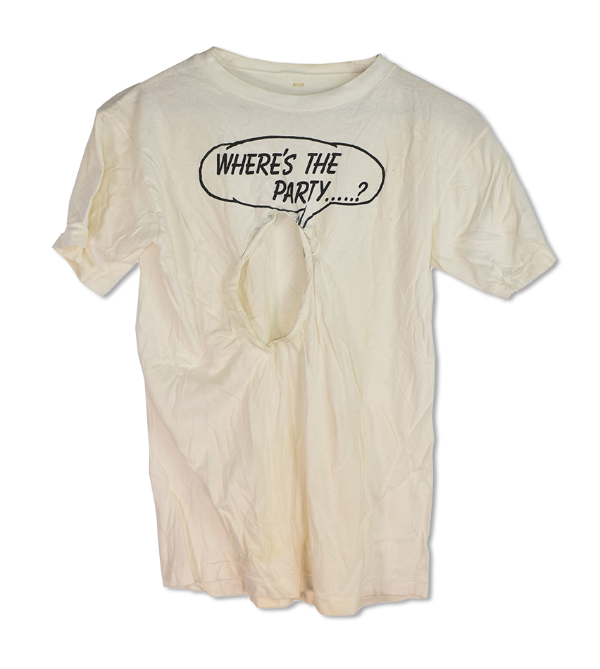 Steve Clark's white, "Where's the Party.....?" tee. The shirt is in good condition but missing the plastic face that used to peek through the hole in the front. Maybe he's at the party? Courtesy of the Lorelei Shellist Private Collection.