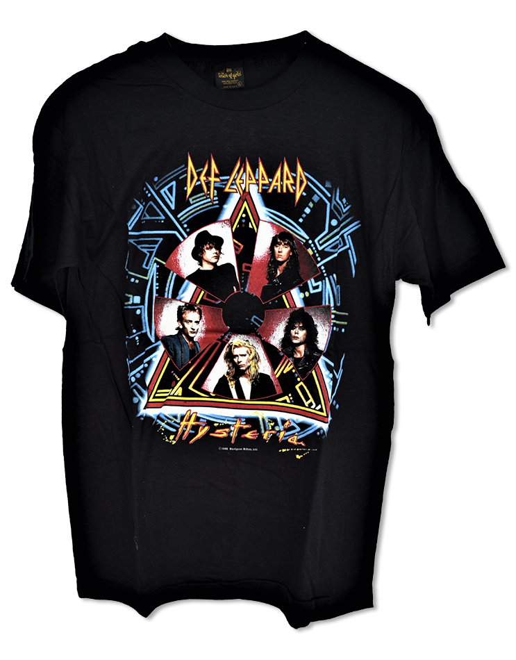 Steve Clark's Hysteria tee with band photo on the front. Large Hysteria logo with blue and green design on the back. In good condition. Courtesy of the Lorelei Shellist Private Collection.