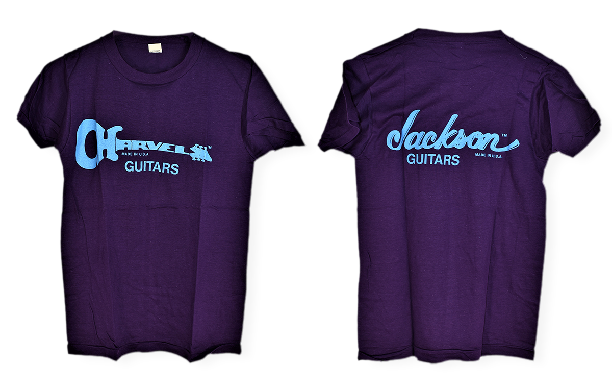 Steve Clark's awesome purple Charvel Guitars tee, with baby blue Charvel logo printed on the front, and baby blue Jackson Guitars logo printed on the back. Charvel was founded in the 1970's by Wayne Charvel in Azusa, California, and is now owned by Fender. Courtesy of the Lorelei Shellist Private Collection.