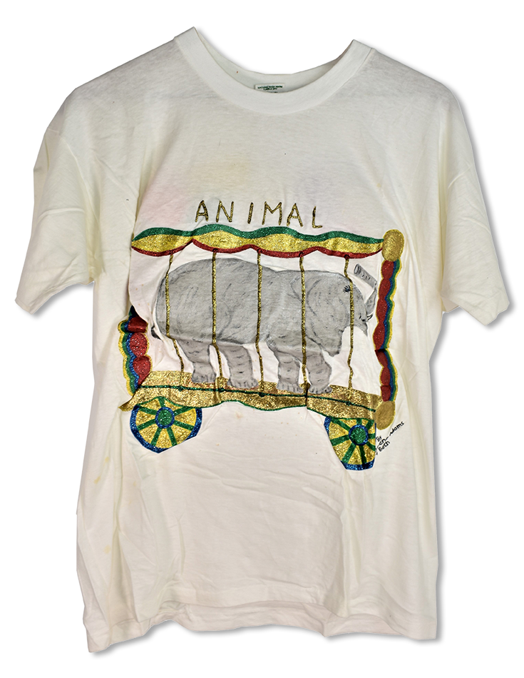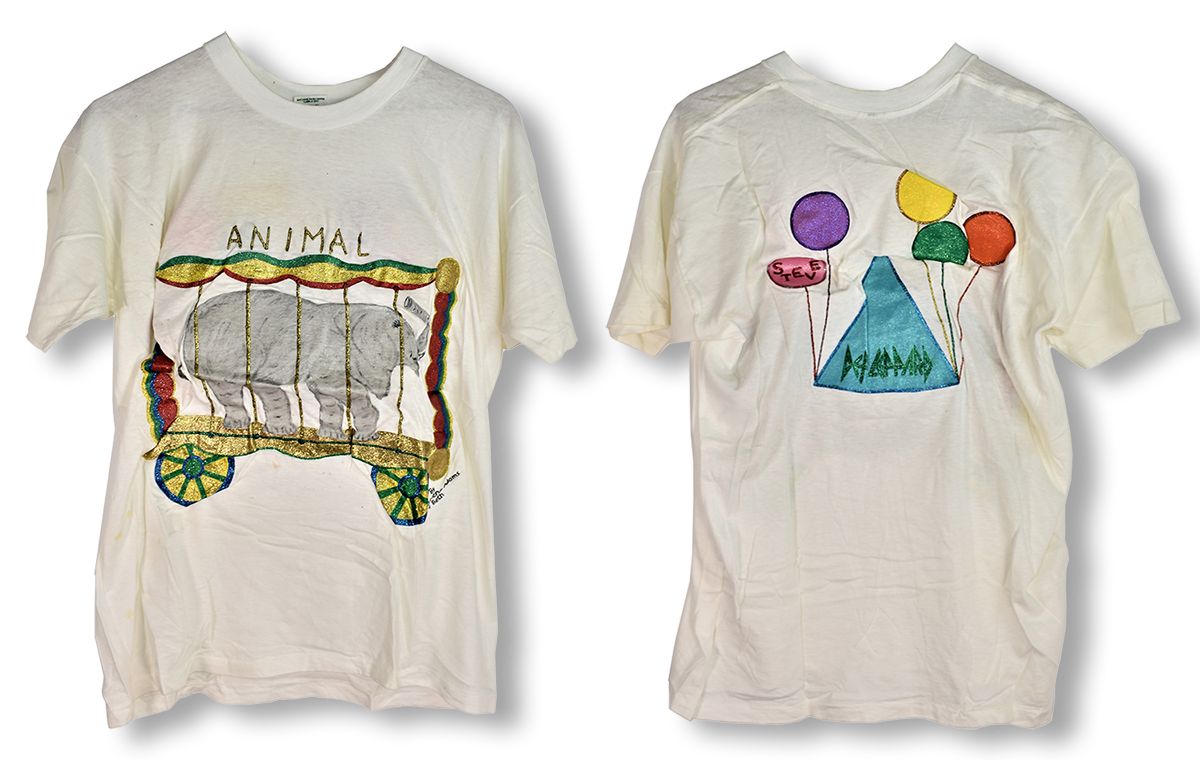 Steve Clark's own fan-made t-shirt celebrating the hit single "Animal" from Hysteria. Steve adored this shirt and wore it often. A hand-drawn elephant in a glitter-paint cage adorns the front, and a sparkly blue and green Def Leppard logo with balloons (one with Steve's name on it) is drawn in glitter-paint on the back. The fan-artist's name is on the lower corner of the elephant's cage. That Def Leppard/Elephant-admirer wasn't the only one who loves "Animal." It's one of Rick Savage's faves, too. Sav: "I was trying to put a playlist together of just six songs, and I was trying to think, what are my favorite six songs we've ever done? And it's such a tough one. For some reason, I really, really like, and still like and have always liked "Animal." There's something about that lead vocal that just draws me in every single time I hear it. And even now when I hear it on the radio, I'm like what a fantastic vocal that is, you know? It's just, it just has a presence, it has a feel, it's got everything, you know? So that's gotta be right up there. I've got to say, I really, really do love that song. It has a special meaning for me as well, because it was our first British hit. It was the first time we ever went top 10 in England. So that in itself kind of, I would always have a soft spot for "Animal." Well, it changed, it evolved through the different years and the different producers. It started off very much as a heavy metal song, with a heavy metal riff at the beginning. Strangely enough, the actual vocal line pretty much survived everything. And it was a very, very rare occasion that you keep the vocals. And we literally replaced the guitars underneath the vocal. The actual vocal line was exactly the same as when we demoed it in Dublin, before we even went into the studio. But the guitar parts behind it had been completely changed and re-done. The only other thing that stayed exactly the same was Phil's guitar solo, which was actually on the demo. And note for note, pretty much stayed the same, but everything else changed. And it just comes about through working with different people." Courtesy of the Lorelei Shellist Private Collection.