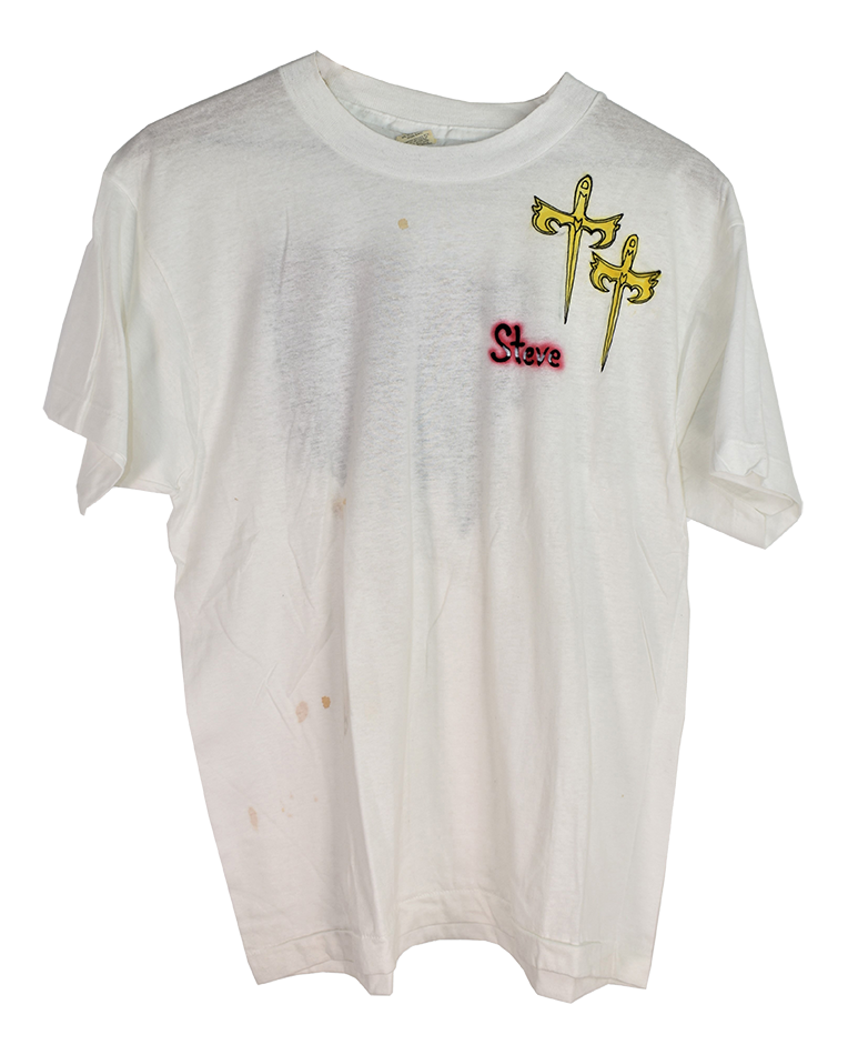 A fan-painted t-shirt tribute to the "Terror Twins." This tee was Steve's, and he was always touched and grateful for fan artwork. Of course Phil and Steve's "Terror Twins" moniker reflected their dual guitar attack on Pyromania and Hysteria, as well as their friendly off-stage antics. Collen and Clark were the very best of mates, and friendships of that depth are a blessing forever. Bonus: a close examination reveals splatter stains on the front and back of the shirt, which look very much like blood. Or coffee. You'll have to make up your own story to match this mystery. Courtesy of the Lorelei Shellist Private Collection.